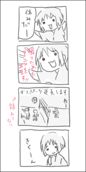 そんなわけで録れてなかったアニメやらバラエティやらがたくさんあって泣きそうです。しかもそういうのって「なんで今回にかぎって!」っていうような面白い回とかにあたるんだよね。あーちくしょー見たかったー!