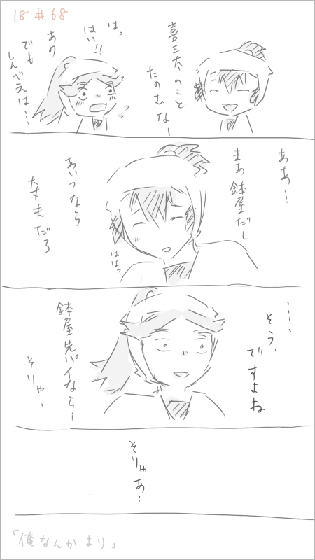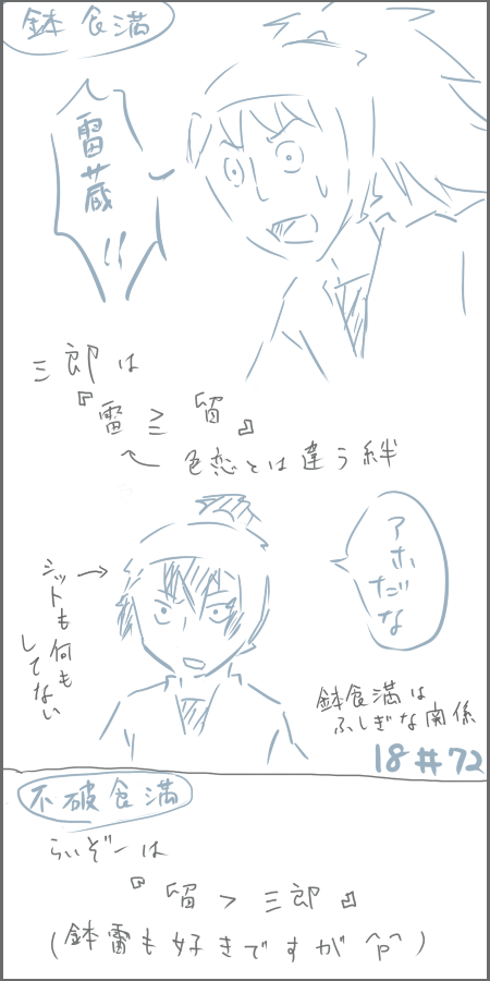三郎雷蔵の絆は本当にまた別というか。恋愛感情じゃないんだけど(食満受けサイトだから)。それと同等というか…三郎からの矢印に至ってはそれ以上だとも思う。そして食満は別にそれに嫉妬しないという、また難しい関係がなんか好きです。