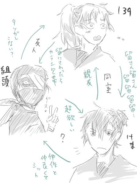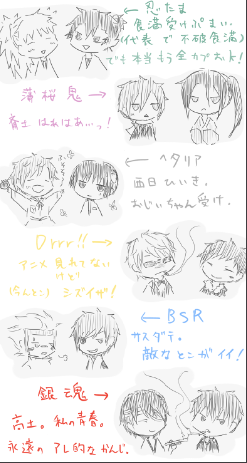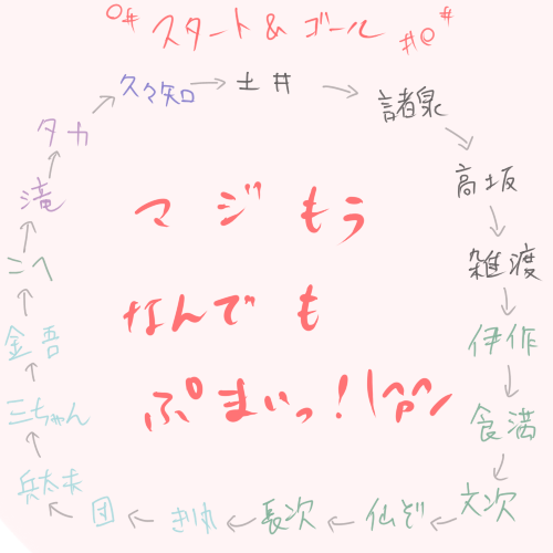 何となくありそうなカプで繋げてみたんですが…これ全キャラ入れるように円書いても絶対いけるよね。でっかい円書けるよね。よーし永遠に廻りり続けろ腐のスパイラル!