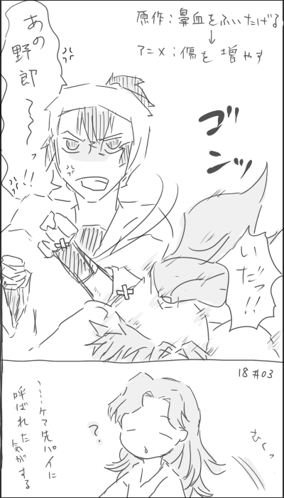 原作では優しいお父さんよろしく鼻血拭いてあげてたはずなんですけど、アニメでは戦い好き設定が前面に出てますね。それもまたぷまい!