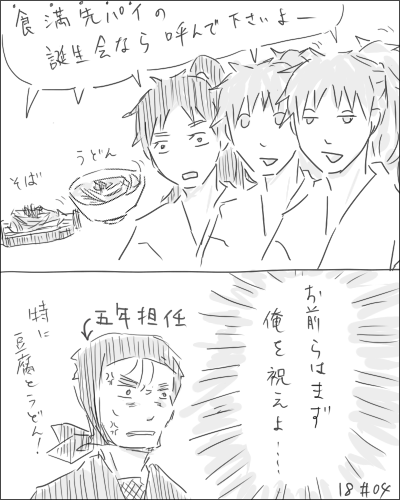 仲良しわいわい五年好きだけどもうお前ら五人とか本当かけないよ面倒くさい。正味な話さいしょの双忍で心折れた。なぜ同じ顔を描かなきゃいけないんだと言うこの気持ち。その反動がうどんと蕎麦にいきましたすみません限界です。