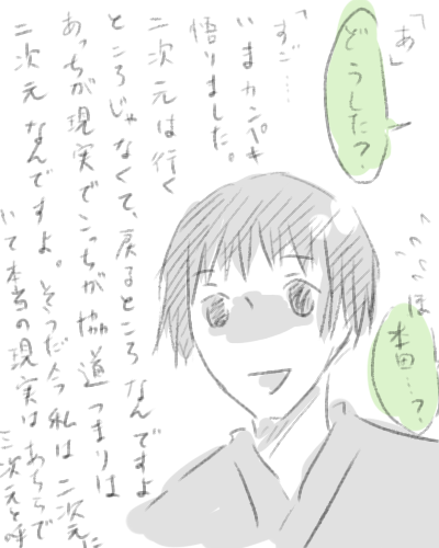 なんだかそういうネタは前からいろんな所で聞いてきたけど「そこまで病んでねーよー!二次元には行きたいけど^p^」とか思ってたら本当に悟った。あれ、ちょっ、本当になるもんなんですね。そう思いこみたいっていうよりも本当に…悟るという言葉が合うというか。ふいに脳がぴくっとなって納得する感じ。すごい。怖い。ちょっ、これになったらもう戻れない気がするマジでかまさか…っ!